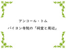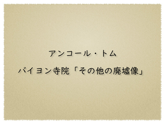 アンコールトムは環濠に囲まれた、周囲12キロにわたる「大王の都」を意味する都市遺跡で、幾世紀にわたるクメール文化が色濃く残っている世界遺産です。重厚な城壁と3メートルの菩薩の顔をもつ南大門。都城の中心に位置し、四面仏尊像など大乗仏教の信仰を反映したバイヨン寺院・・・。この寺院は都城アンコール・トムの中心部にある遺跡です。崩れかかってはいますが、小山の様な量感に富み、芸術性が高い遺跡です。崩れ落ちた石柱や石の欄干が往時の繁栄を語るテラス。回廊の壁面に刻まれた、長く生活感にあふれるレリーフ。とくに四面に観世音菩薩の顔とみなされている人面像が立ち並ぶ多数の塔堂群は有名です。緻密で深いデヴァター(女神)やアプサラ(天女)の浮き彫り。そして大蛇の胴体を引くヒンズー教の神々、蛇神ナーガの石像も見ごたえがあります。歴史が保たれているヒンズー教と仏教の文化、また王の権威を示した廃墟の中にも、宗教芸術と歴史が持つ重みに荘厳さが加わり、歴史のロマンが潜んでいます。 アンコール・トムの遺跡の中で、とくにバイヨン寺院は熱帯雨林に埋もれた文明の栄枯盛衰を示し、歴史のロマンを語る寺院遺跡です。訪れる人々の心を揺らし続けます。(潮 信輔)