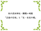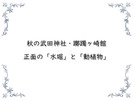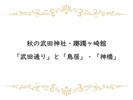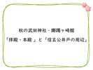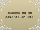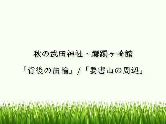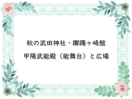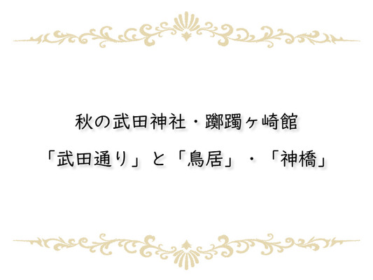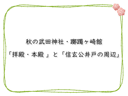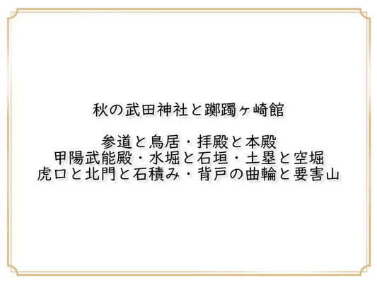 TOP > テーマ別おすすめ画像 > 秋の甲府・武田神社と躑躅ヶ崎館 (参道と鳥居・拝殿と本殿 甲陽武能殿・水堀と石垣・土塁と空堀 虎口と北門と石積み・背戸の曲輪と要害山)